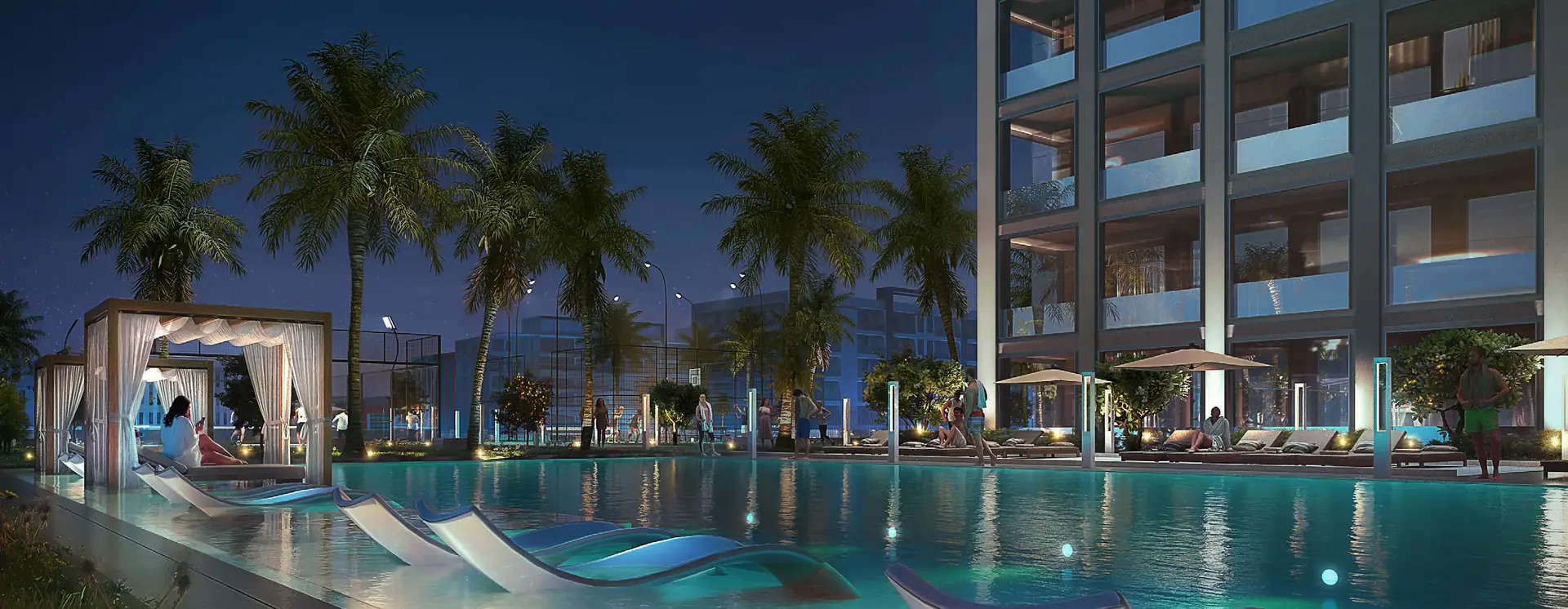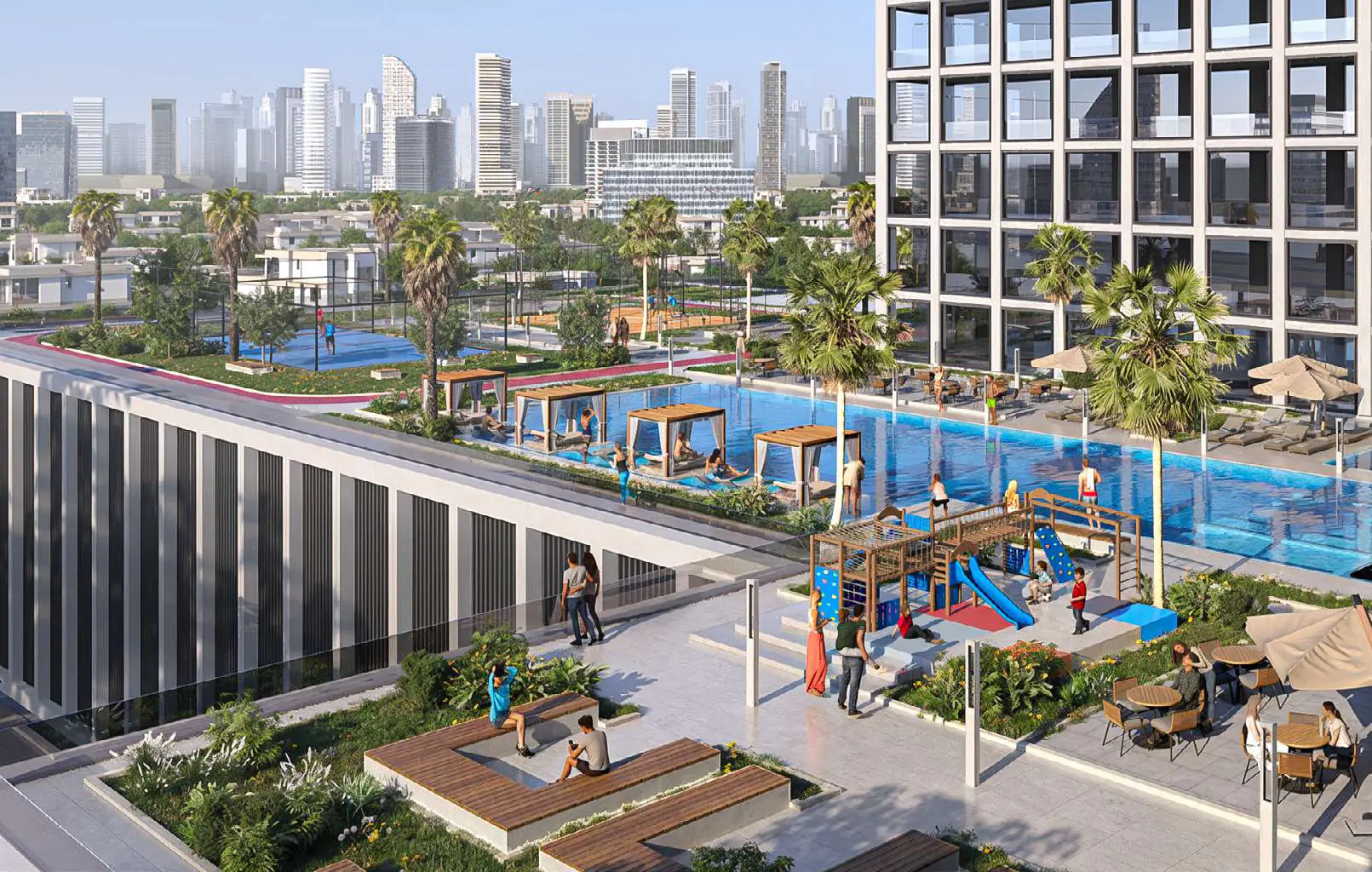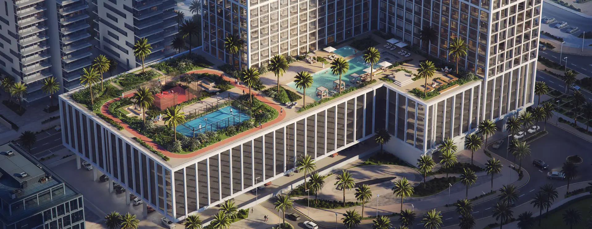 Residents enjoy access to an expansive amenity deck that promotes both activity and tranquillity. Highlights include an adult and kids pool, padel and basketball courts, indoor and outdoor gyms, a yoga area, outdoor cinema, plaza, and jogging track, all designed to foster a vibrant and health-conscious community.